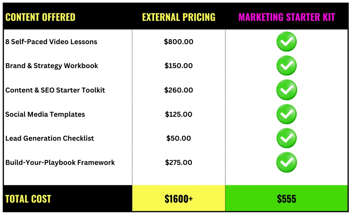 You’re not just getting a few lessons—you’re building a complete marketing system. This kit is designed to walk you step-by-step through brand building, strategy development, and growth execution. Every tool, template, and video is crafted to help you simplify marketing, gain confidence, and take action—without hiring a team or burning out.