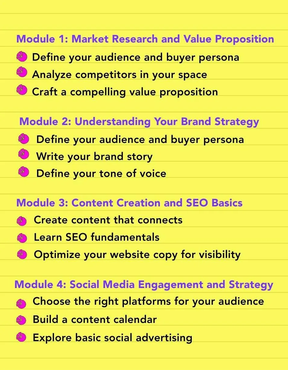 In just four modules, you’ll build your personalized marketing playbook—complete with branding, messaging, content strategy,